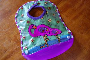 で、ビニール製のものを。↑これ、食べこぼしをキャッチしてくれるし、ポケットは取り外しOK!本体は丸洗いできるのが良いですね!